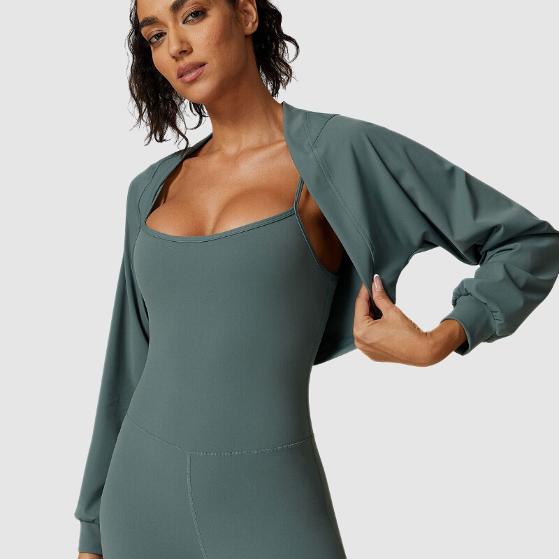 Aktif giyim katmanlamalarına modern bir yaklaşım sunan bu ceket, yüksek belli taytlar, eşofman altları veya şortlarla kusursuz bir şekilde uyum sağlayan rahat ve şık bir kesim sunar.