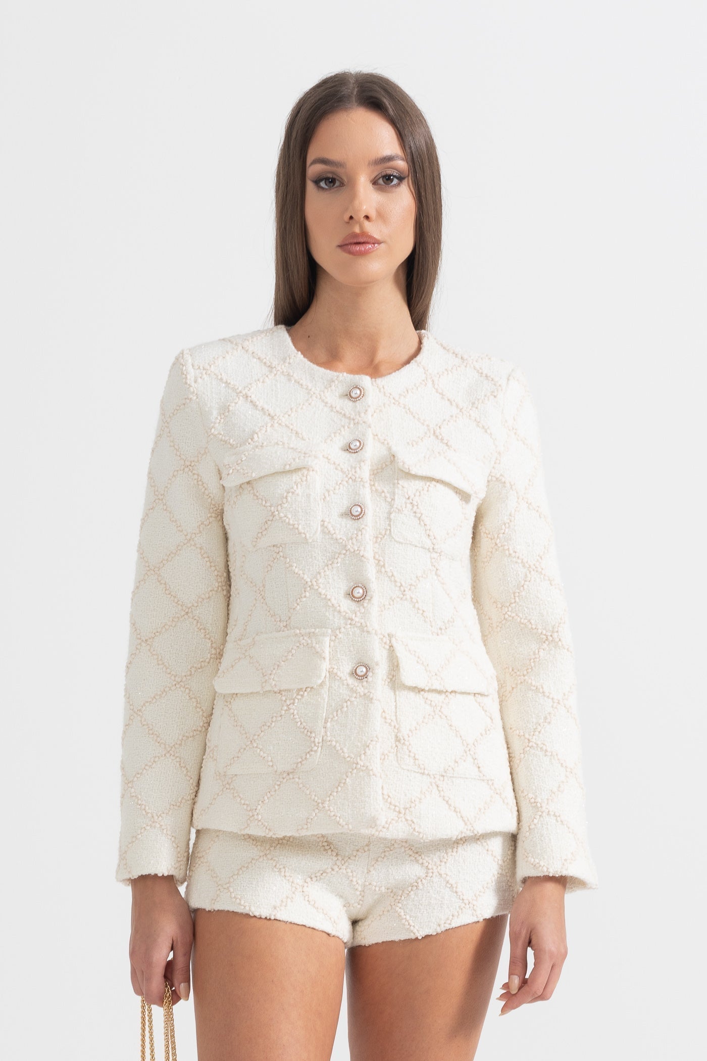 İvoire Dokulu Ceket ve Uyumlu Şort Takımı – Altın Düğmeli