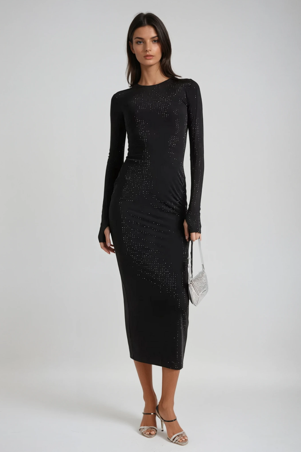 Anoki Siyah Taşlı Dar Kesim Uzun Elbise