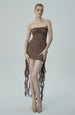 Bu çarpıcı straplez mini elbise, ışıltılı kumaşı, taş işlemeleri ve dinamik fırfır detaylarıyla özel davetlerde dikkat çekici bir görünüm sunuyor. Omuzları açıkta bırakan modern tasarımı, feminen ve sofistike bir hava katarken, ışıltılı kahverengi kumaşı ile ışığı mükemmel bir şekilde yansıtır.