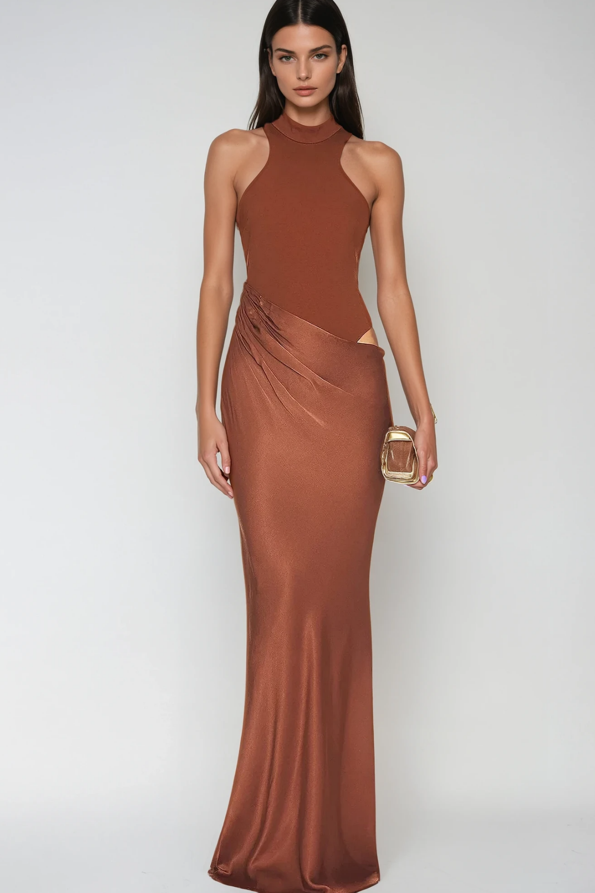 Beres Tank Top Saten Uzun Elbise Kahverengi