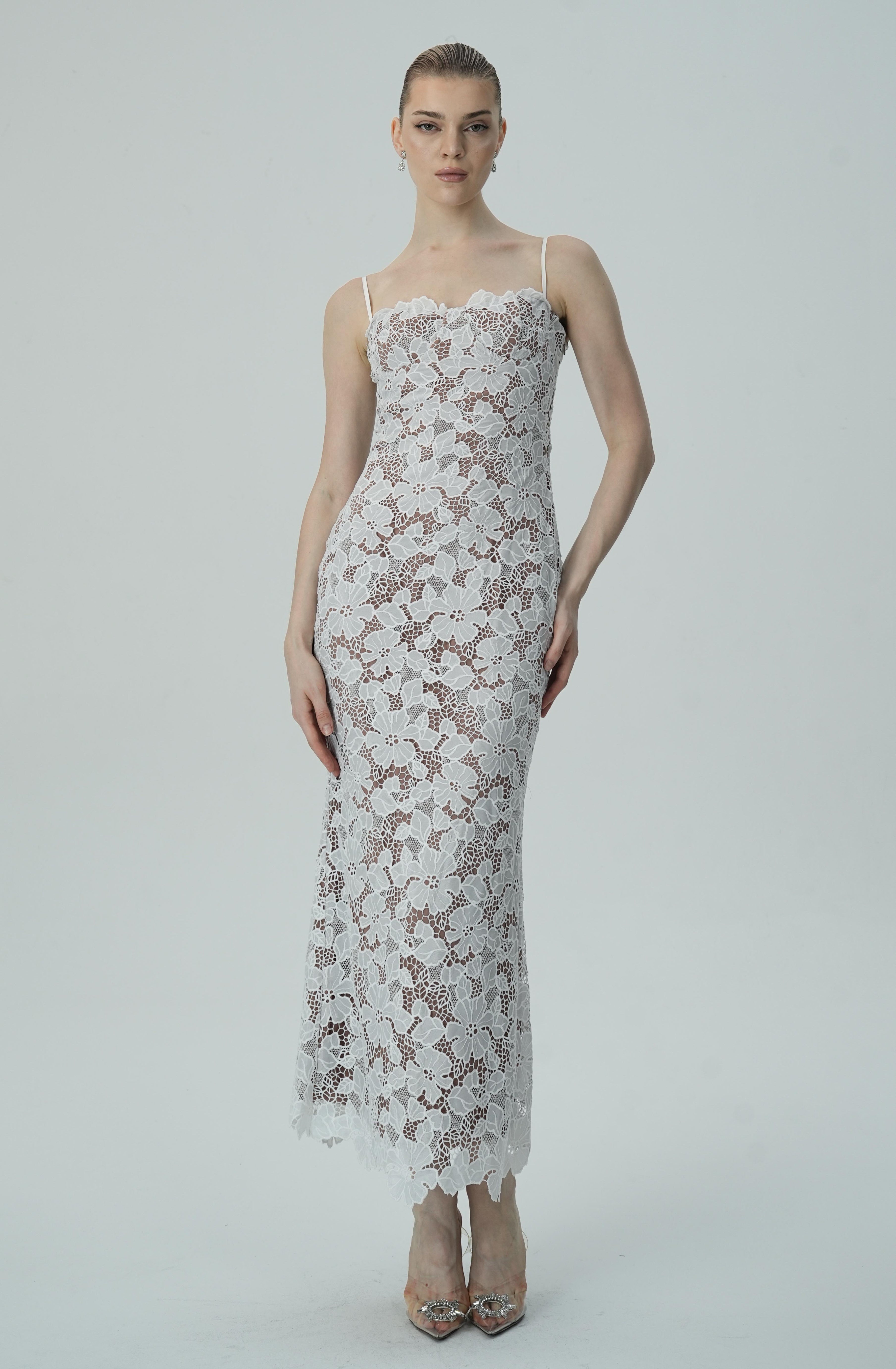 Bu şık ve romantik dantel elbise, ince çiçek dantel işlemeleri, spagetti askıları ve vücuda oturan kesimiyle sofistike bir görünüm sunuyor. Tam boy tasarımı, zarif ve akıcı bir duruş sağlarken, zamansız beyaz rengi elbiseye klasik ve asil bir hava katıyor. Özel davetler ve resmi etkinlikler için mükemmel bir seçim!