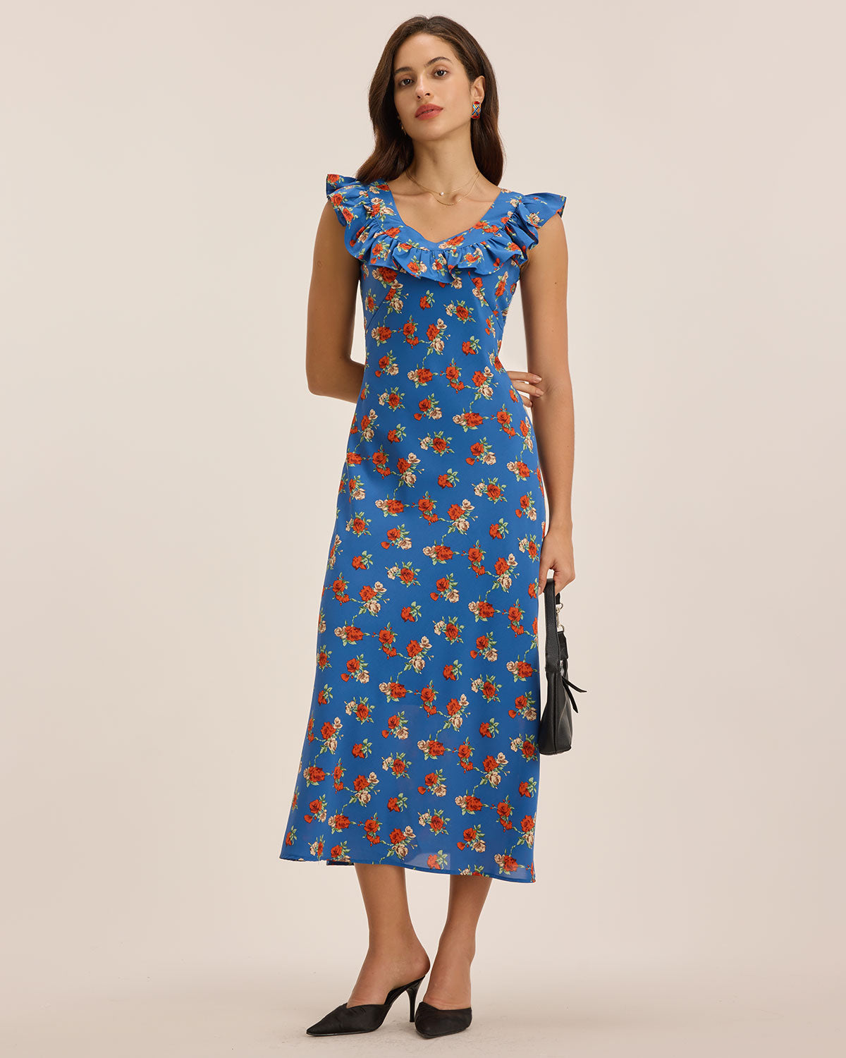 Sueña™ Mavi Çiçekli Volanlı Kolsuz Uzun Elbise