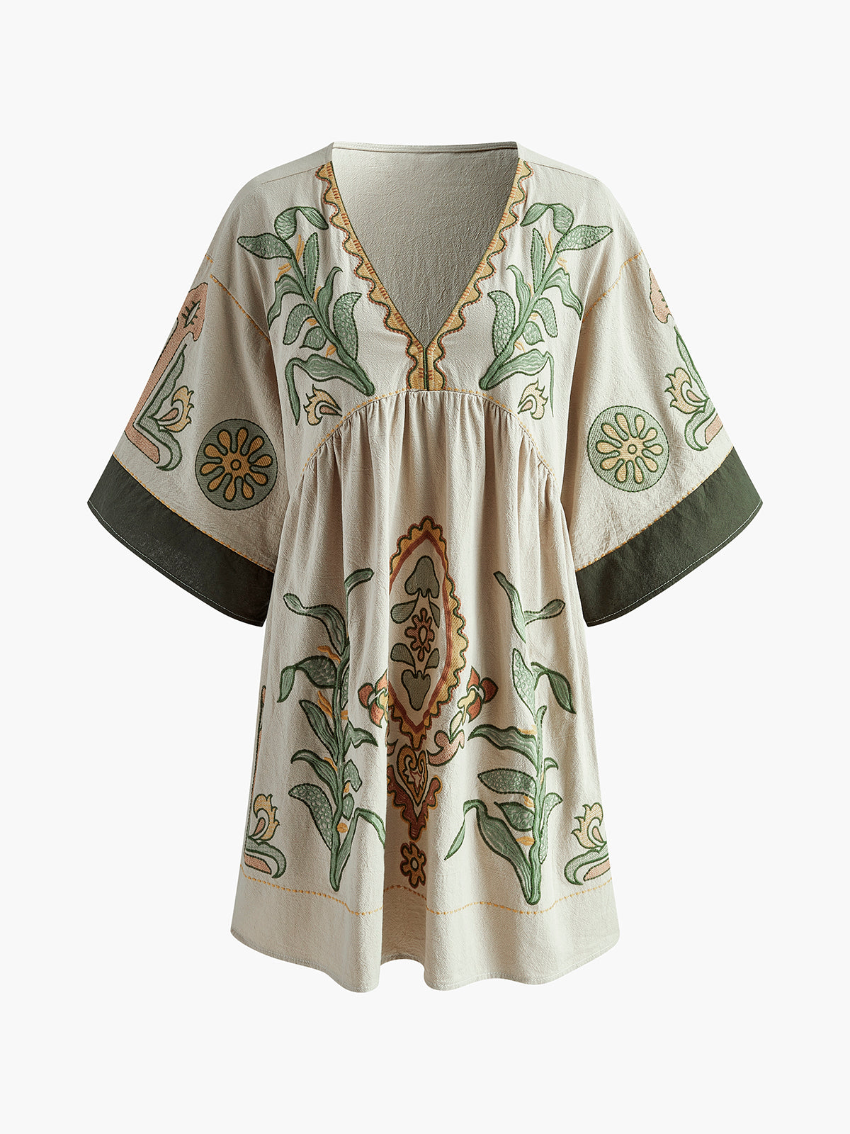 Bu işlemeli kısa elbise, hafif ve rahat kumaşı, zarif işlemeleri ve feminen kesimiyle hem günlük hem de tatil şıklığı için mükemmel bir tercihtir. V yaka tasarımı modern bir görünüm sunarken, yarım kol detayı rahat bir kullanım sağlar.