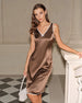 Kahverengi Kontrast V Yaka Saten Midi Elbise