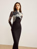 Çarpıcı çiçek desenleriyle birleşen yüksek yaka tasarımı, bu siyah uzun elbiseyi benzersiz kılıyor. Dar kesimiyle zarif bir siluet sunarken, detaylarıyla sofistike bir görünüm sağlıyor. Özel davetler için mükemmel bir seçim!