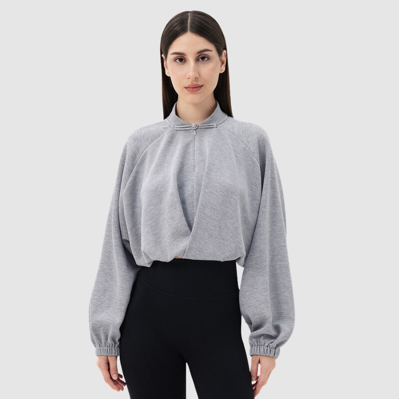 Bu Crop hırka, konfor ve zarafetin mükemmel bir karışımıdır. Drapeli ön kısmı ve büzgülü manşetleriyle, spor salonundan günlük kullanıma zahmetsizce geçiş sağlayan rahat ama şık bir görünüm sunar. Hafif ve nefes alabilen kumaş, gün boyu konfor sağlarken, düğme detaylı yüksek yaka, benzersiz ve sofistike bir dokunuş katar.