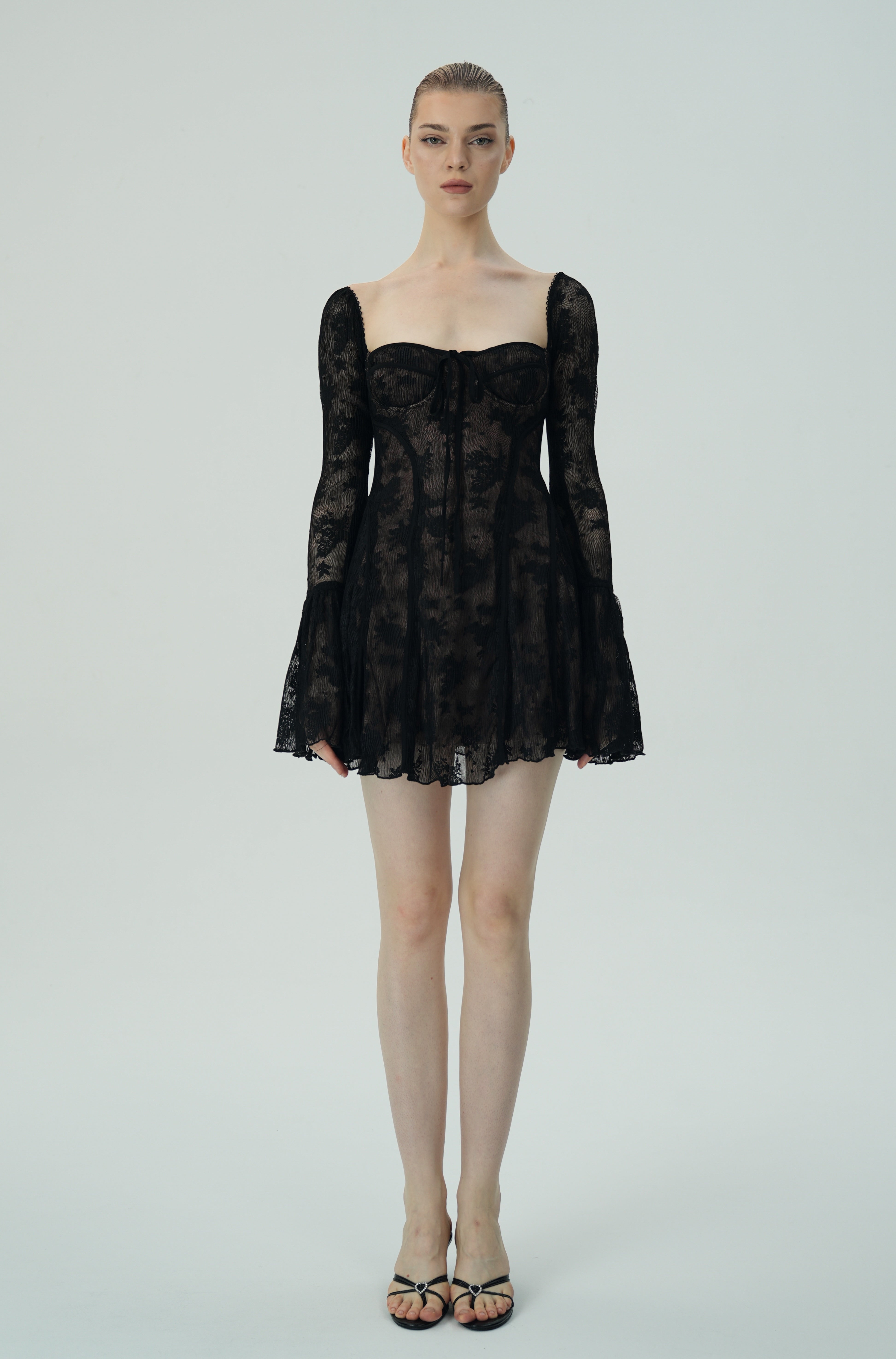 Bu zarif mini elbise, detaylı dantel kumaşı, hareketli çan kolları ve ön bağcık detayıyla feminen ve modern bir stil sunuyor. Beden oturan gövde kesimi beli vurgularken, A kesim eteği özgürce hareket etme imkanı tanır. Genç ve enerjik havasıyla hem günlük hem de özel günlerde rahatlıkla kullanılabilecek bir tasarım!