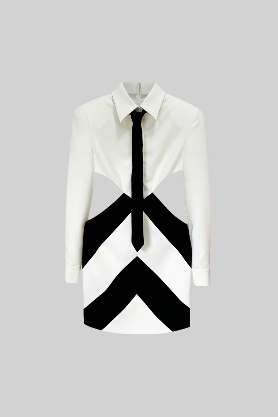 Beyaz Modern Elbise – Entegre Gömlek Üst ve Kravat Detaylı