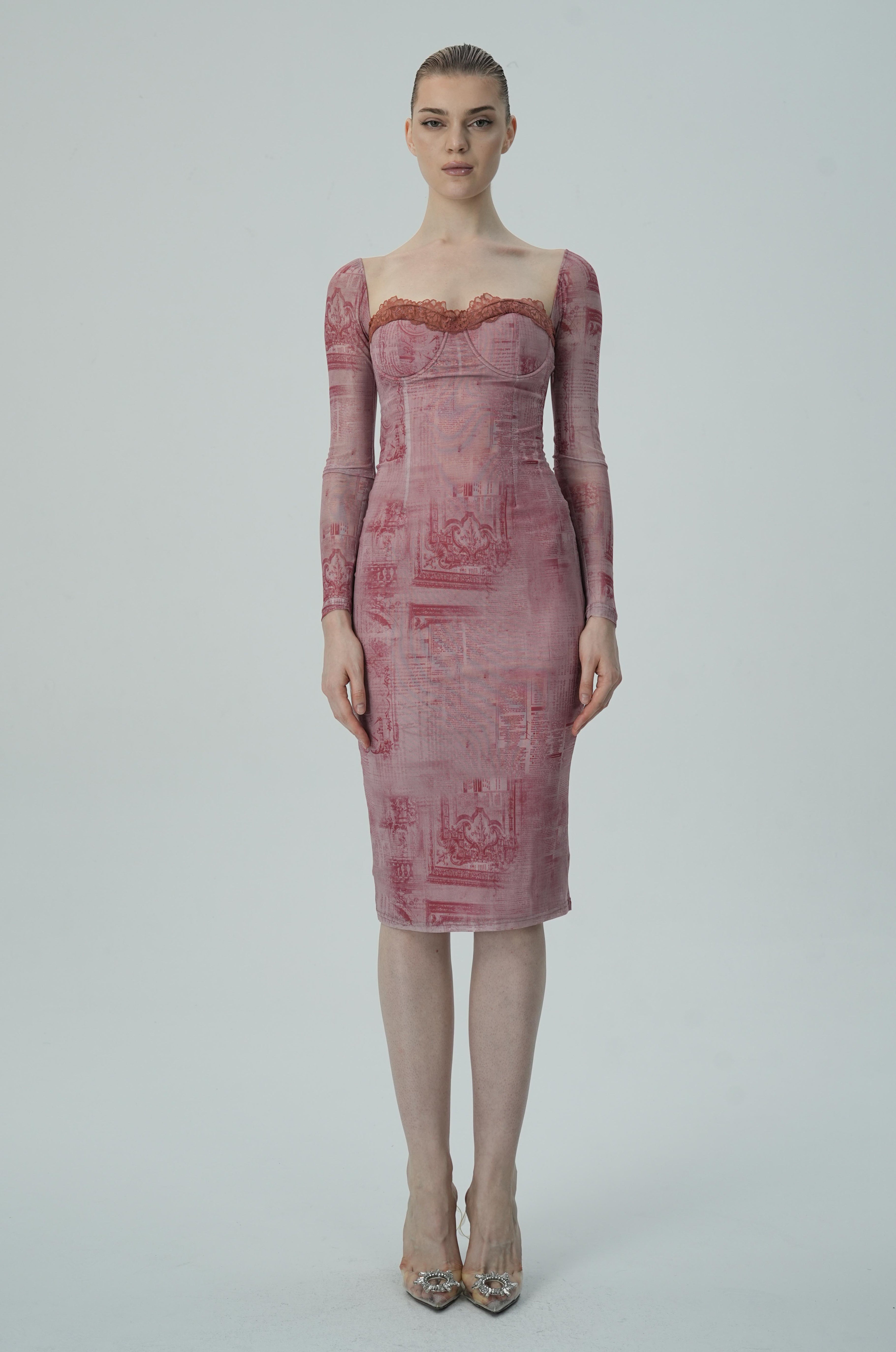 Bu şık midi elbise, vintage esintili özel deseni, zarif dantel yaka detayı ve vücuda oturan siluetiyle sofistike bir tarz sunuyor. Esnek ve yumuşak kumaşı, gün boyu konfor sağlarken, uzun kolları ve midi boy kesimi ile hem resmi hem de şık akşam davetleri için ideal bir seçimdir.
