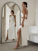 Sofistike halter yaka tasarımı ve yırtmaç detayıyla zarif bir görünüm sunan bu beyaz elbise, özel davetler ve şık etkinlikler için mükemmel bir seçimdir. Bel dekoltesi ve akıcı kesimiyle modern ve çarpıcı bir stil sağlar!