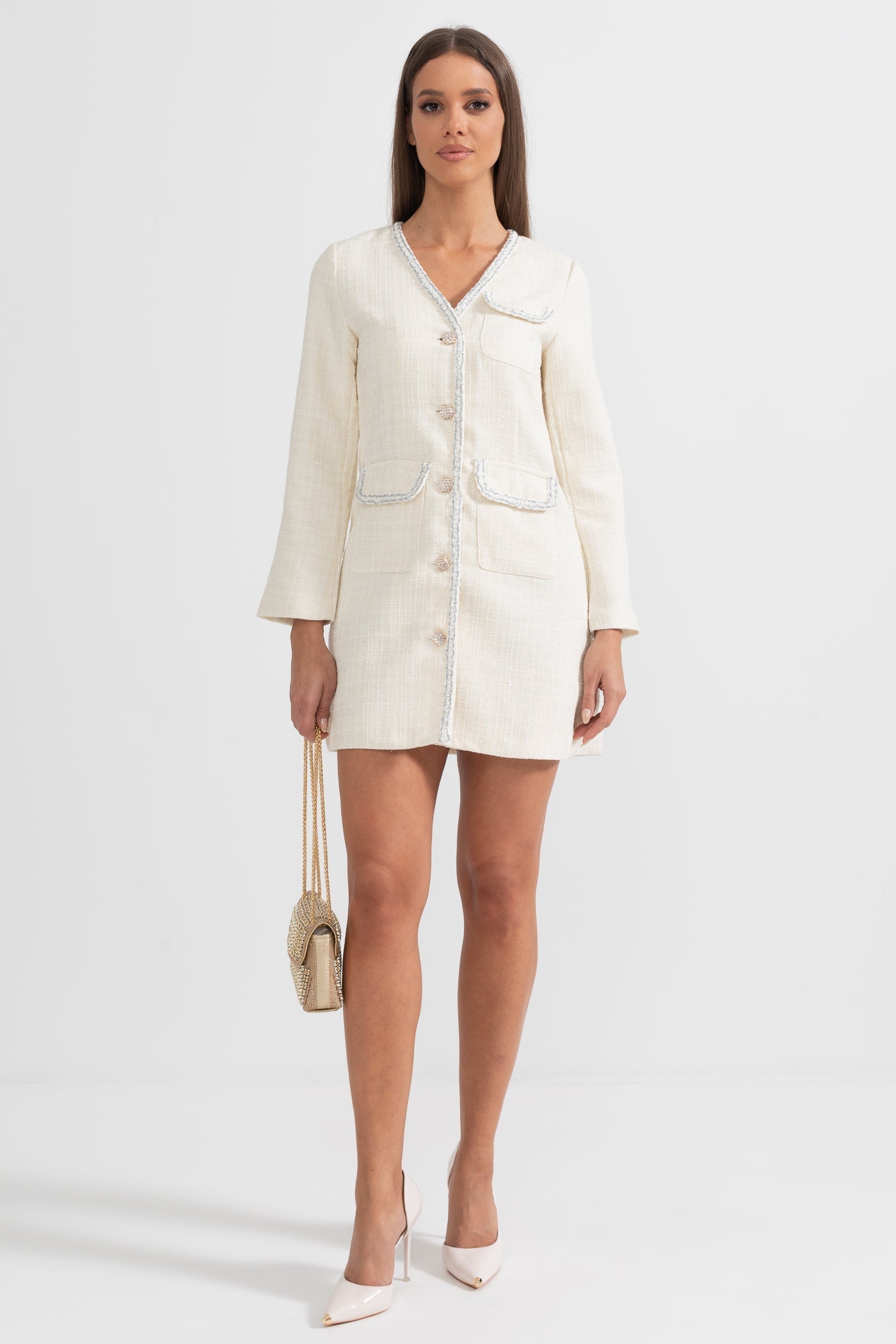 Zarif ve sofistike tasarımıyla Beyaz Modern Gümüş Dikiş Detaylı Elbise, lüks detayları ve modern çizgileriyle dikkat çekiyor. Hafif kumaşı sayesinde konfor sunarken, gümüş örgü dikiş detayları ve dekoratif cep süslemeleri elbiseye sofistike bir hava katıyor.
