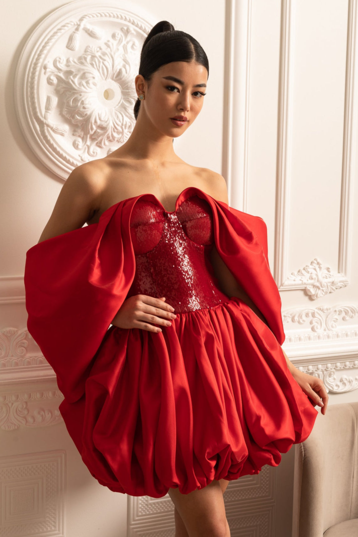 Kırmızı Omuz Açık, Hacimli Etekli ve Akışkan Kollu Elbise