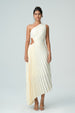 Bu şık midi elbise, asimetik tek omuz kesimi, zarif pileli kumaşı ve şık yan dekolte detayıyla hem modern hem de sofistike bir görünüm sunuyor. Hafif ve akıcı yapısı, gün boyu konfor sağlarken, zamansız krem rengi her türlü aksesuarla kolayca kombinlenebilir.