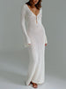 Zarif örgü detayları ve derin V yaka tasarımıyla dikkat çeken bu beyaz maxi elbise, bohem şıklığı modern bir dokunuşla birleştiriyor. Uzun kollu tasarımı ve hafif dokusuyla yaz akşamları için ideal bir seçim!