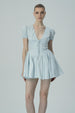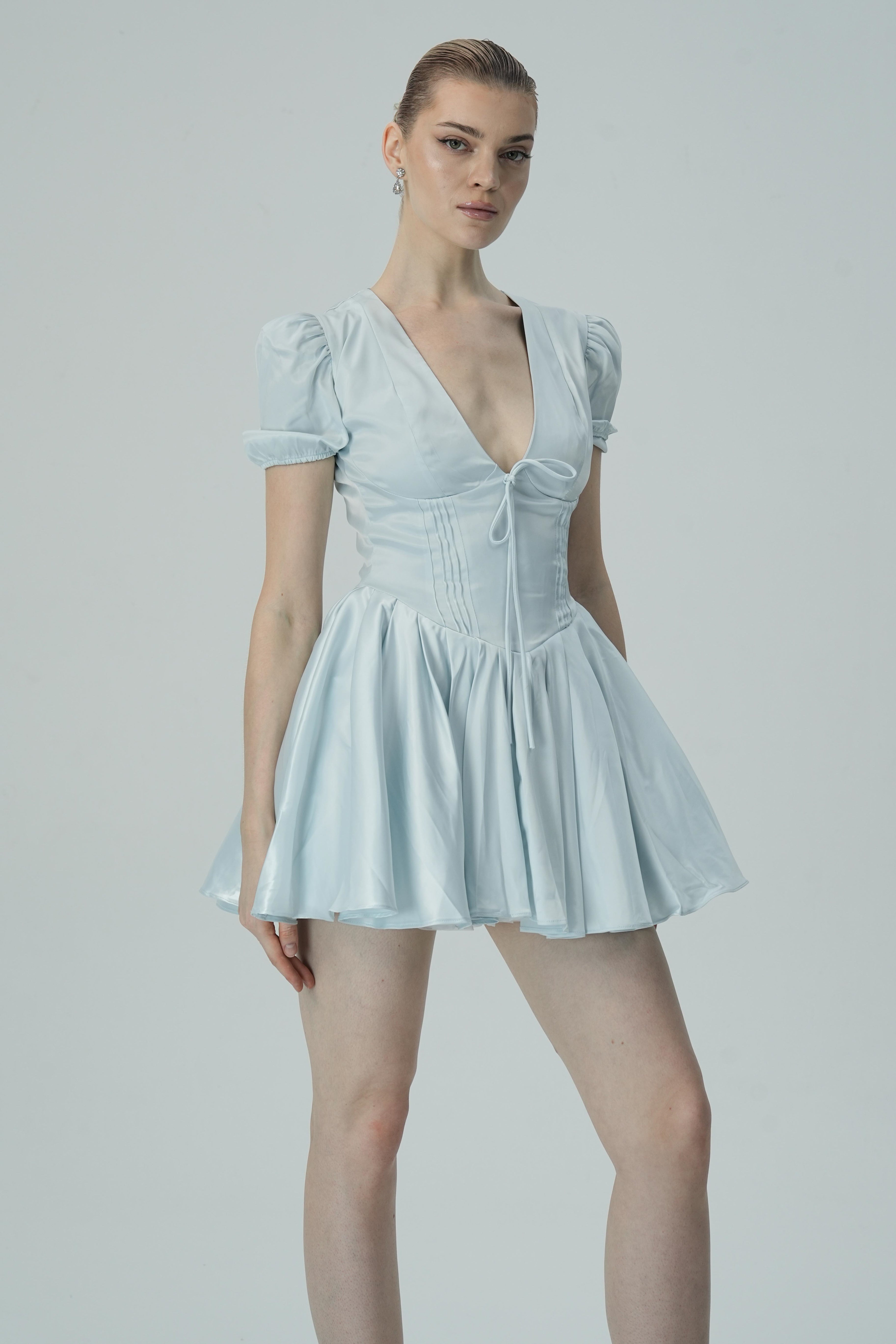Bu şık mini elbise, balon kolları, derin V yaka kesimi ve korse detaylı beliyle modern ve sofistike bir görünüm sunuyor. Hafif kumaşı, sıcak hava etkinlikleri için mükemmel bir seçenekken, kabarık mini etek tasarımı feminen ve eğlenceli bir siluet oluşturuyor.