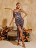 Vanda Bağcıklı Leopar Desenli Büzgülü Midi Elbise ile cesur ve özgüvenli bir stilin tadını çıkar!