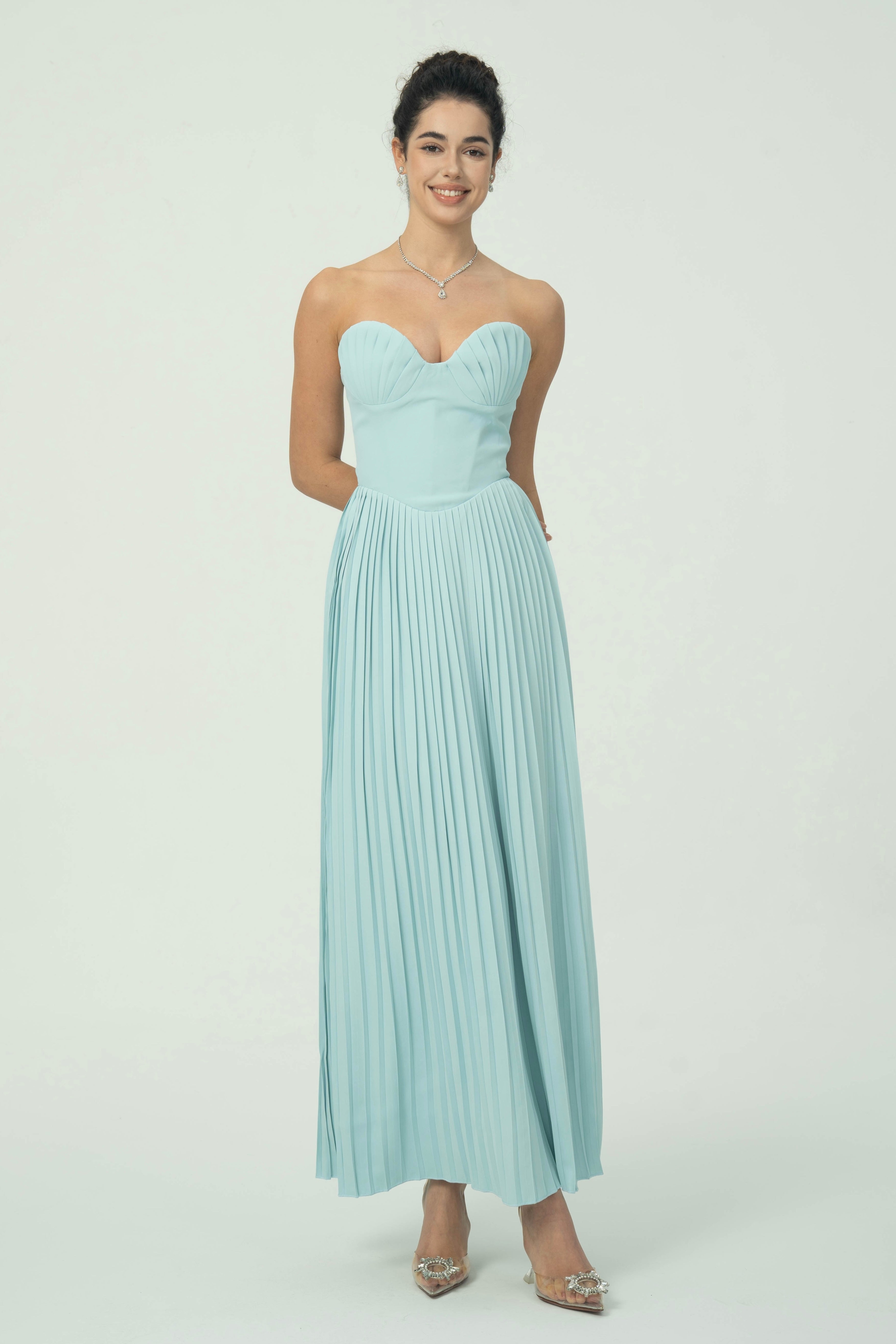 Bu sofistike askısız maxi elbise, tatlı kalp yakası ve akıcı pileli eteği ile resmi davetlerde şıklığınızı ön plana çıkaracak. Yumuşak mavi tonu, sakin ve zarif bir hava katarken, vücuda oturan gövde tasarımı ile bel hattını vurgular.