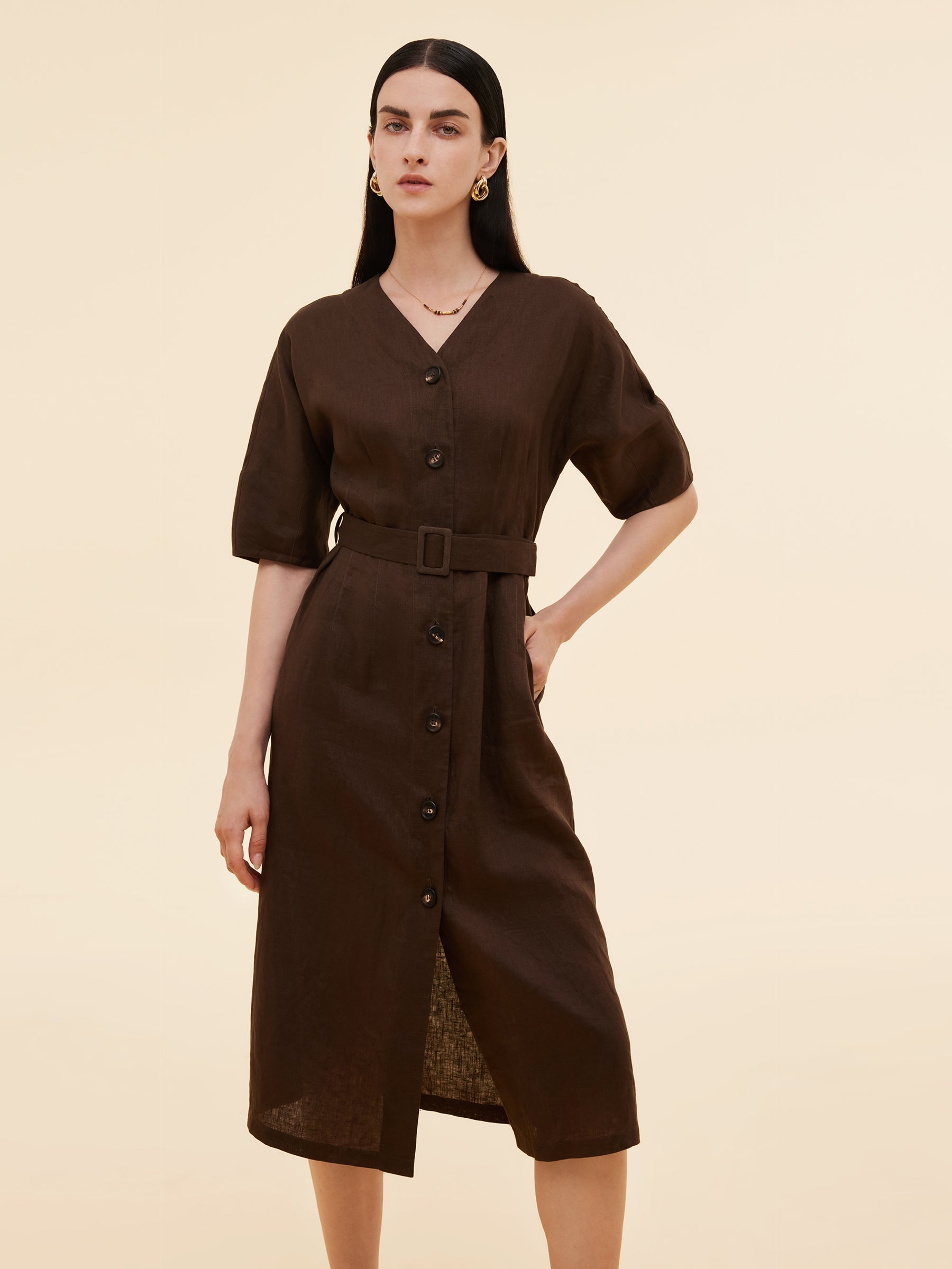 %100 Keten Kadın V Yaka Midi Elbise Kemerli