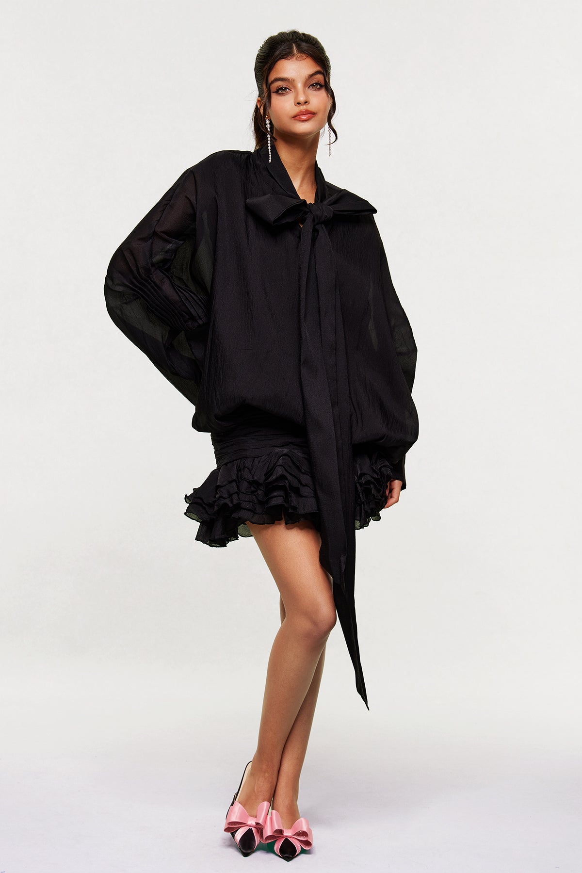 Blerina Fiyonklu Bağcıklı Volanlı Mini Elbise