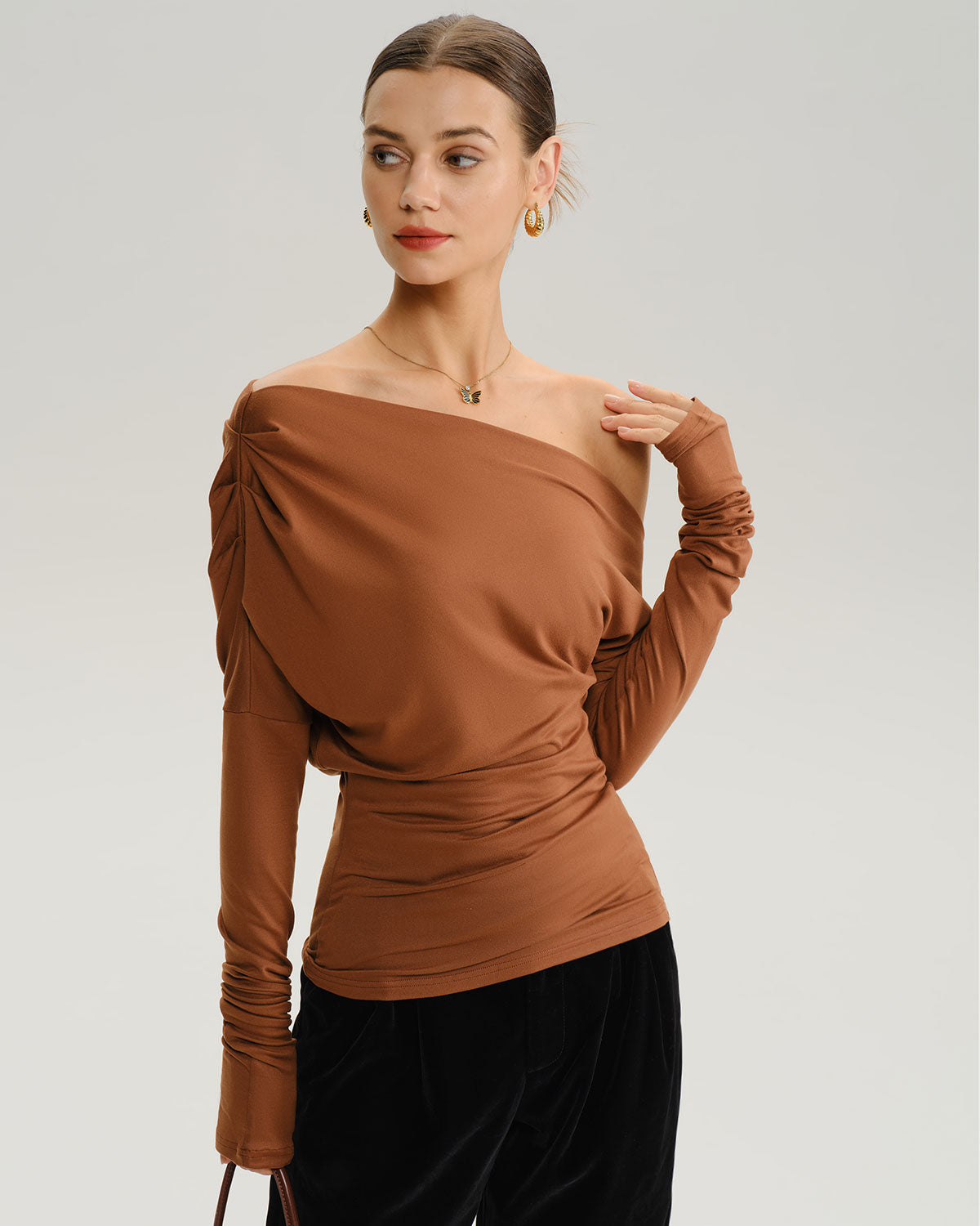 Kahverengi Asimetrik Yarasa Kollu Tişört