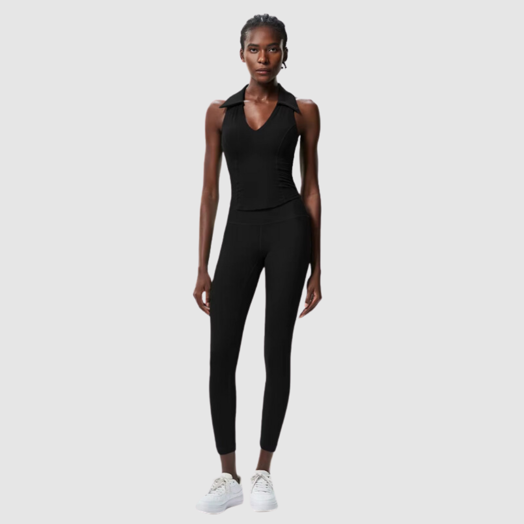 Bu iki parçalı nervürlü spor giyim seti, hem antrenmanlar hem de günlük kullanım için şık ve çok yönlü bir çözüm sunar. Yakalı üst ve yüksek belli tayttan oluşan özel tasarım, şıklığı işlevsellikle bir araya getirerek yoga, pilates veya şık bir spor şıklığı için mükemmel bir seçimdir.