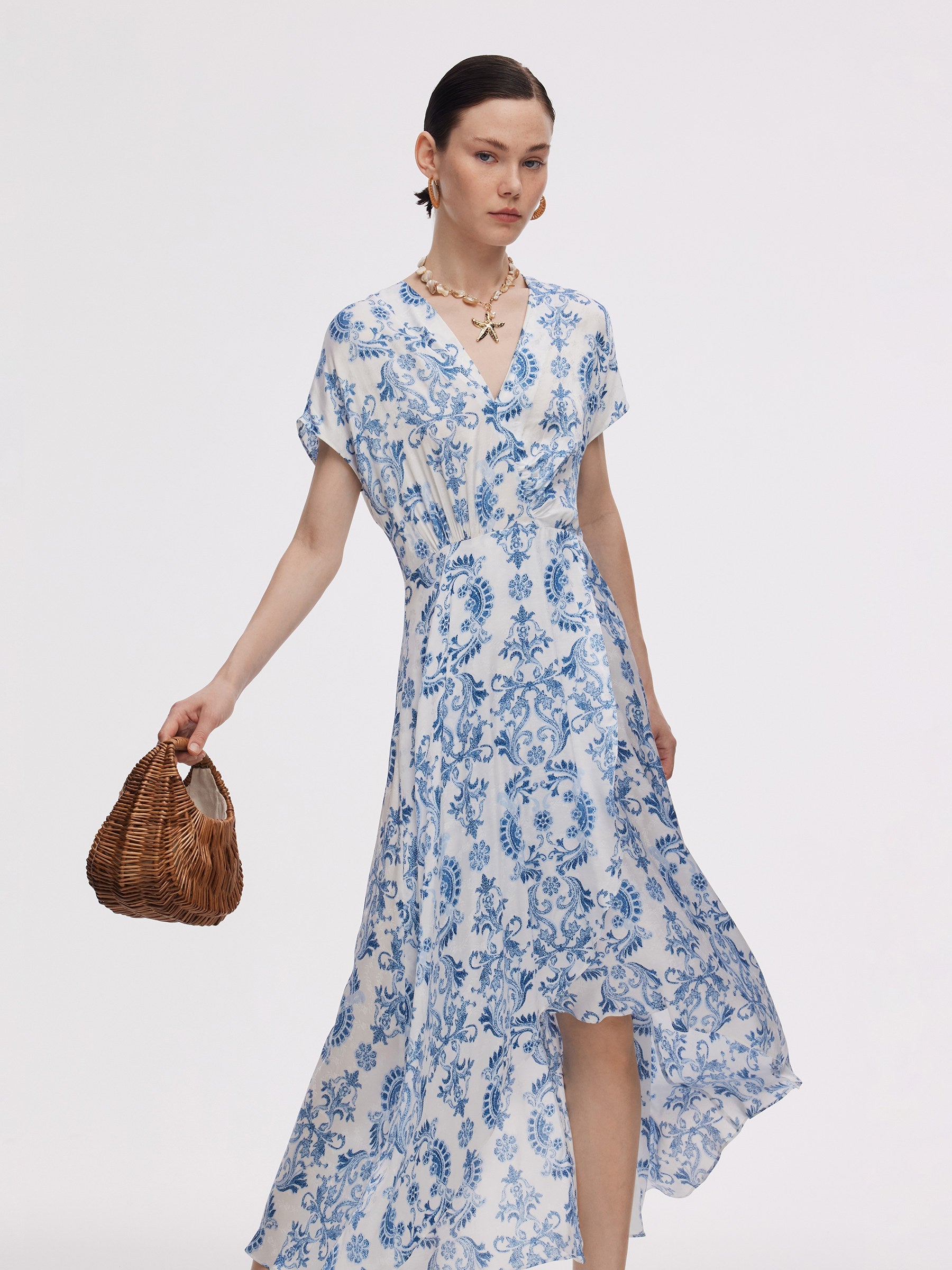 Çiçek Desenli Asimetrik Etek Kadın V Yaka Uzun Elbise