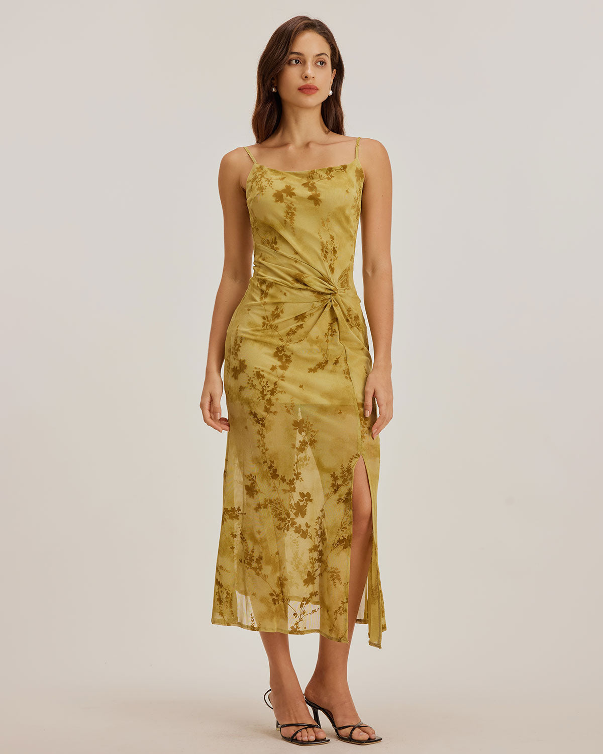 Sueña™ Yeşil Çiçekli Büzgülü Slip Midi Elbise