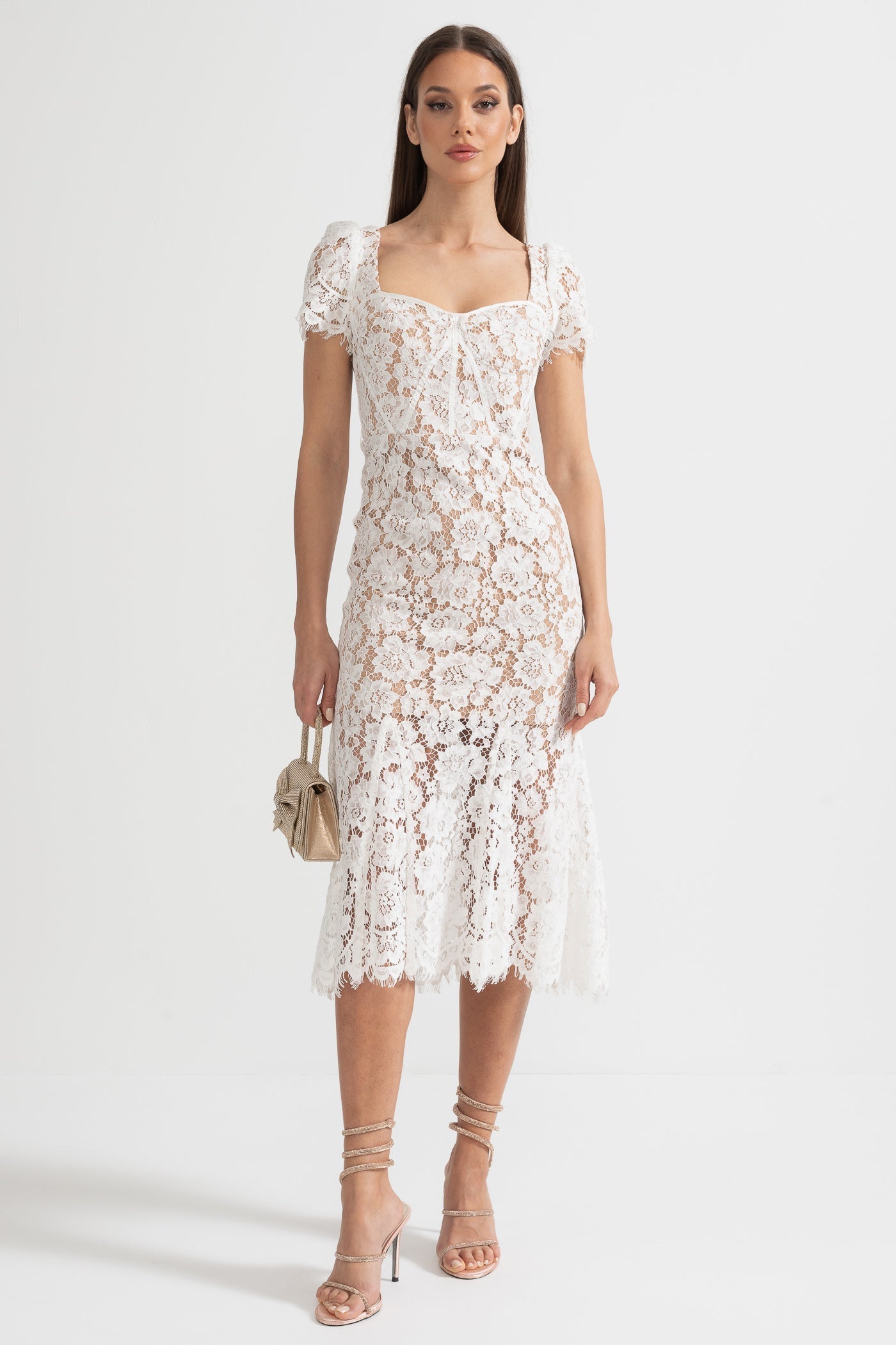 Beyaz Kısa Kollu Dantel Elbise, Uyumlu Bel Kemeri ile
