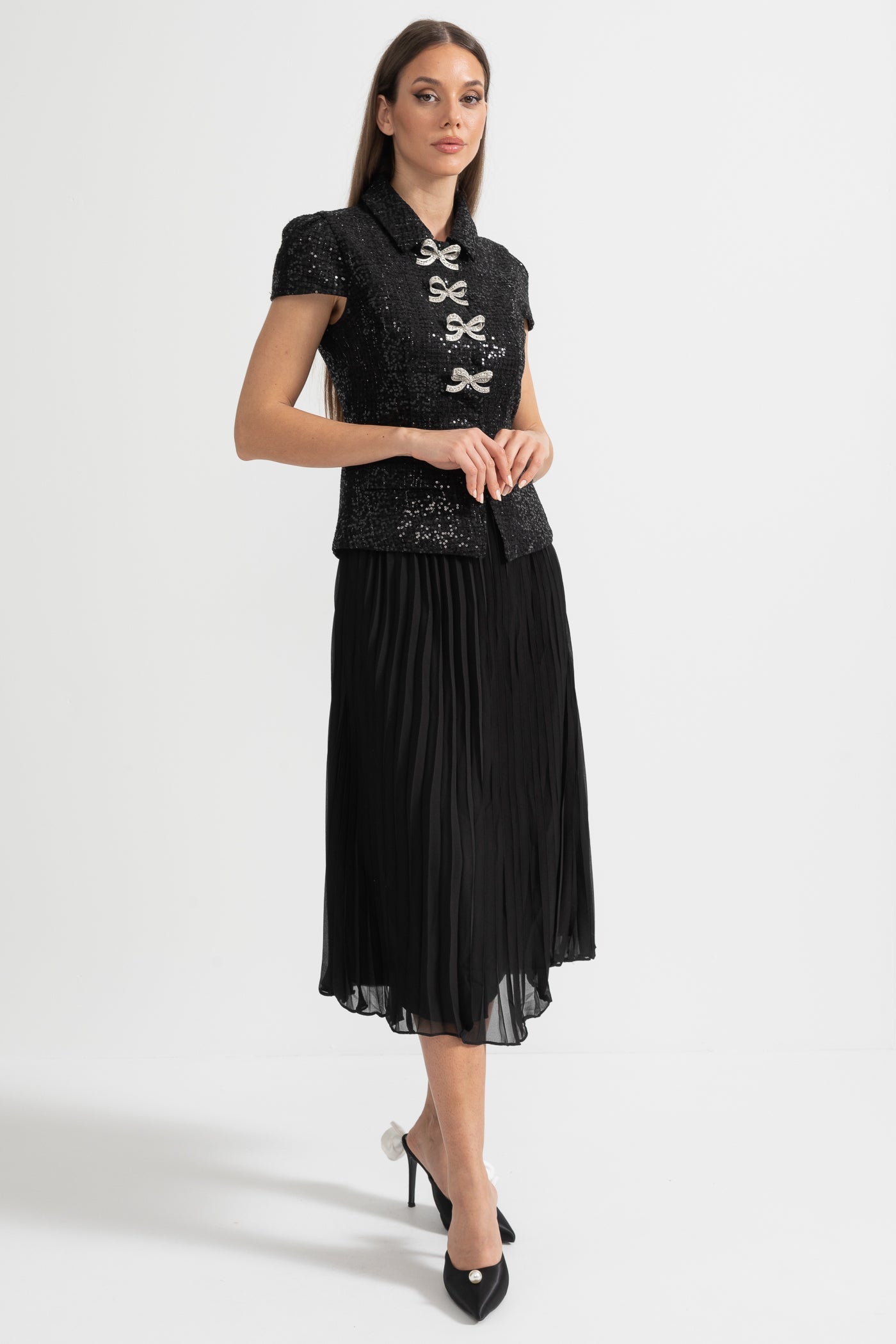 Siyah Şık Set, Simli Üst ve Fırfırlı Etek ile