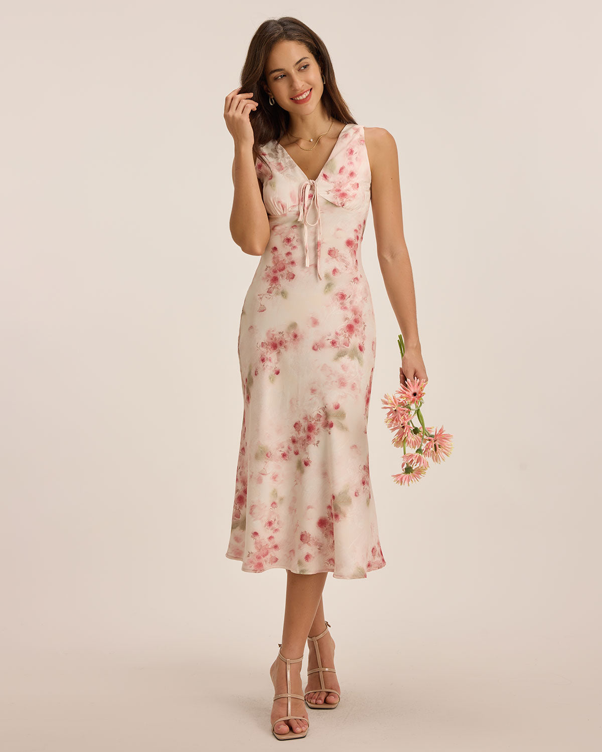 Sueña™ Pembe Çiçekli Kıvrımlı Kolsuz Uzun Elbise