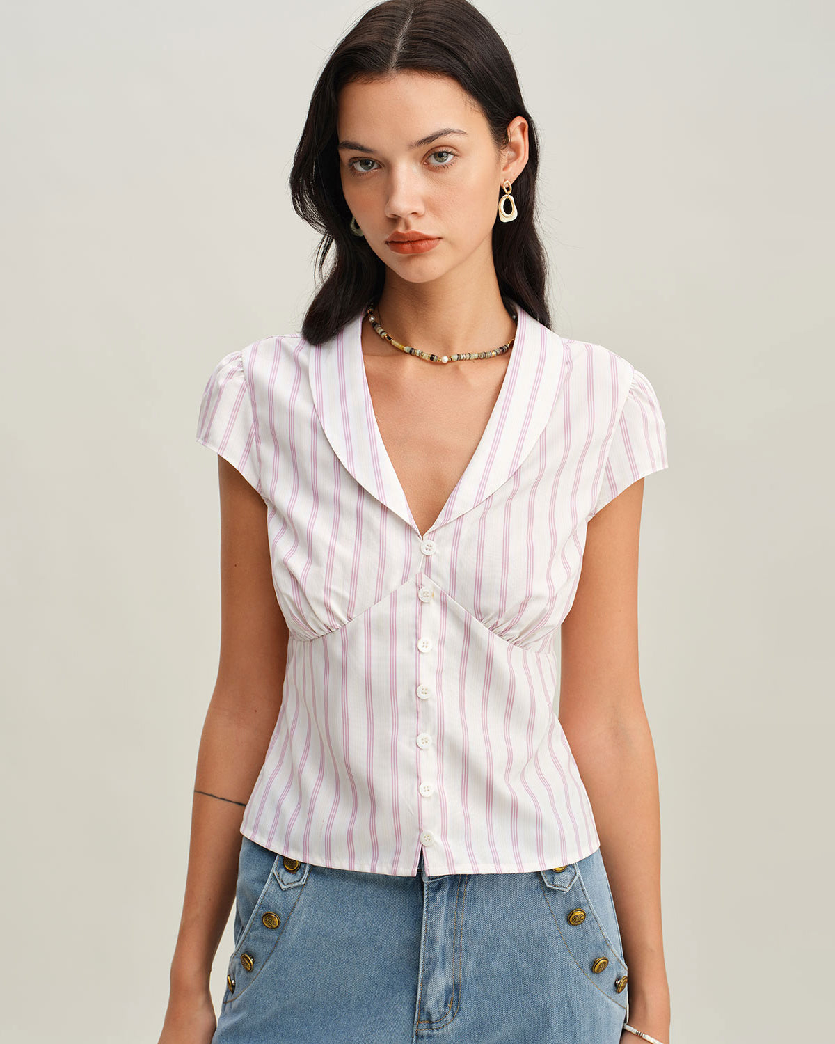 Sueña™ Pembe Çizgili Kısa Kollu Düğmeli Bluz