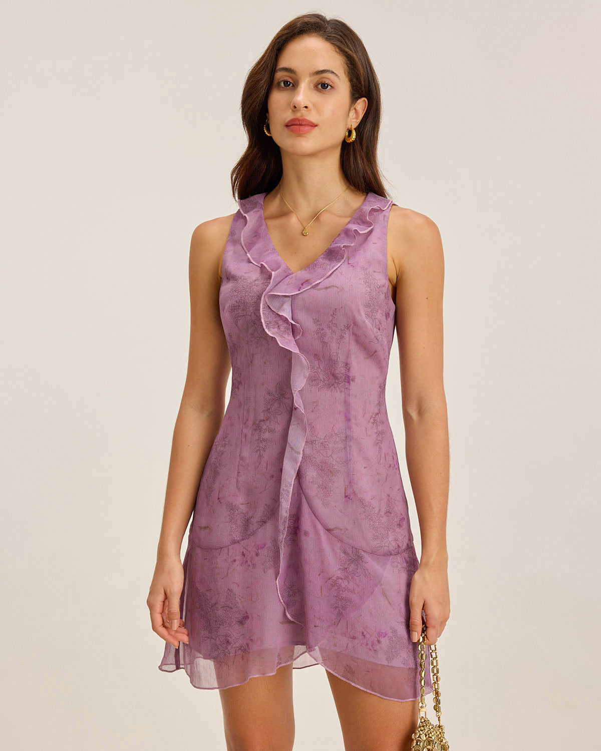 Sueña™ Mor Çiçekli V Yaka Volanlı Kolsuz Mini Elbise