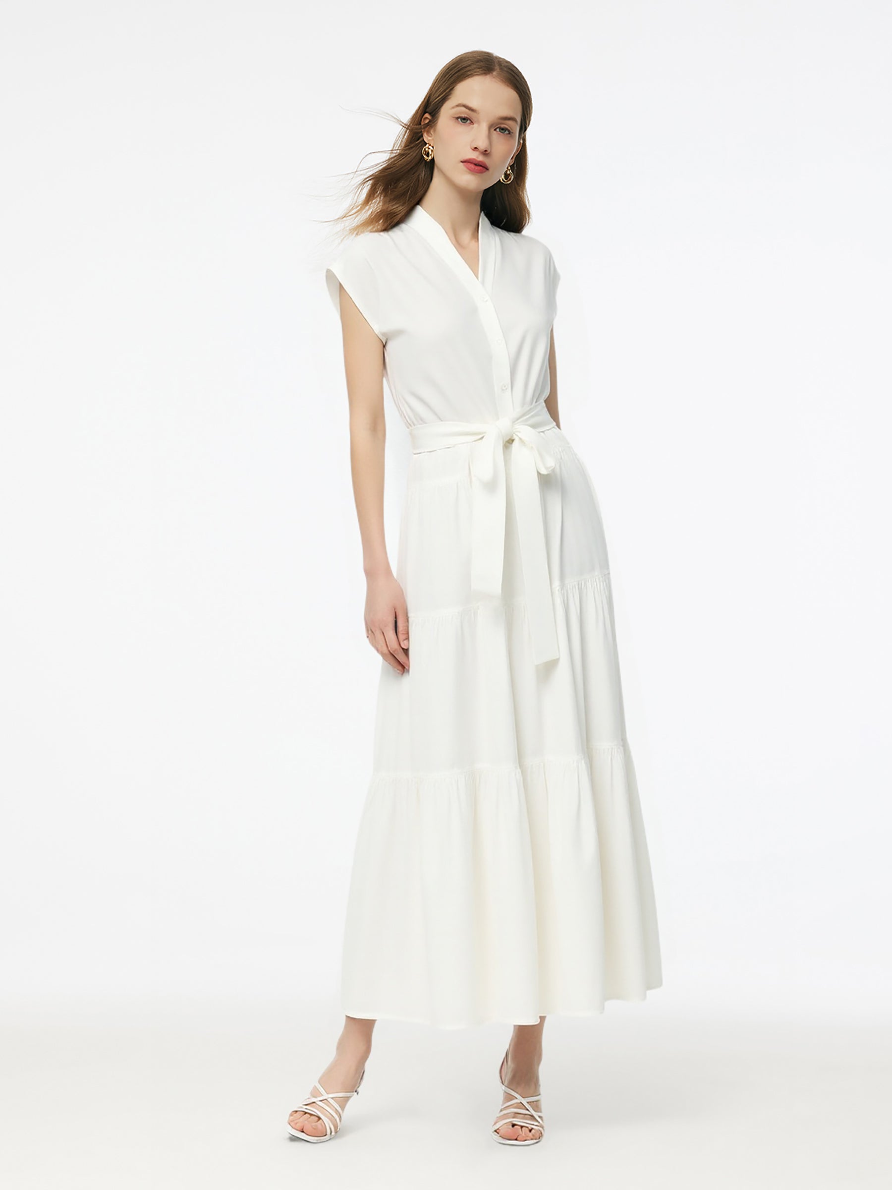 Tencel Karışımlı Kadın V Yakalı Uzun Elbise Kendinden Bağlamalı Kemerli Uzun Elbise