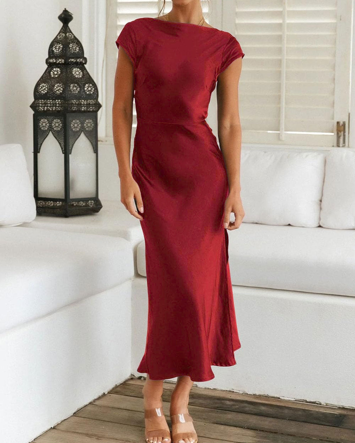 Şarap Kırmızısı Kapüşonlu Yaka Sırtı Açık Midi Elbise
