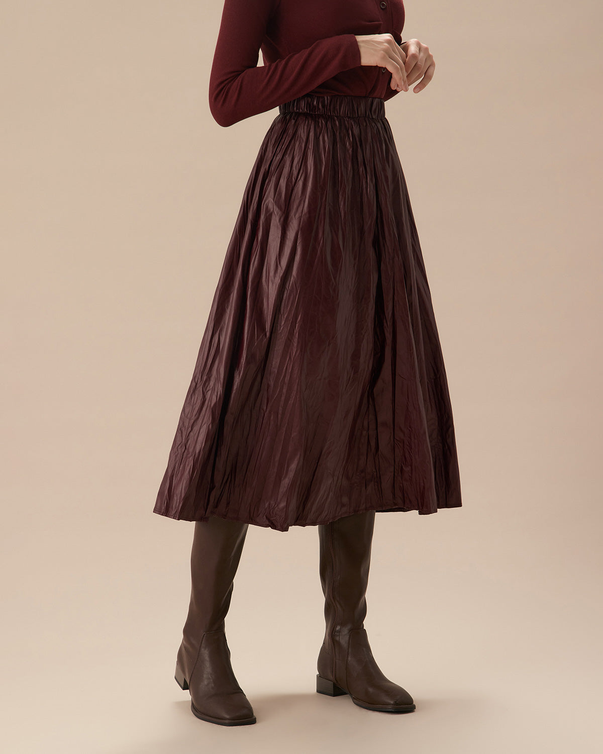 Şarap Kırmızısı Lastikli Bel Büzgülü Midi Etek
